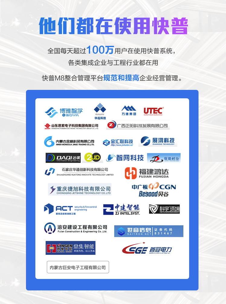 快普M8整合管理平臺(tái)專注工程行業(yè),深入項(xiàng)目管理啟動(dòng)、計(jì)劃、實(shí)施、執(zhí)行、收尾等五大過(guò)程,實(shí)現(xiàn)以項(xiàng)目管理為線索,以預(yù)算、成本和合同管理為主要手段,對(duì)工程項(xiàng)目進(jìn)行有效地組織、計(jì)劃、協(xié)調(diào)和控制,實(shí)現(xiàn)合理配置資源、保障良好的項(xiàng)目效益。